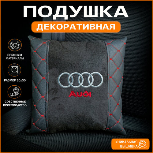 Подушка в машину декоративная с логотипом Audi - это стильное и функциональное дополнение для вашего автомобиля. Изготовленная из матовой экокожи и вставки из алькантары, она обеспечивает комфорт и удобство для пассажира.