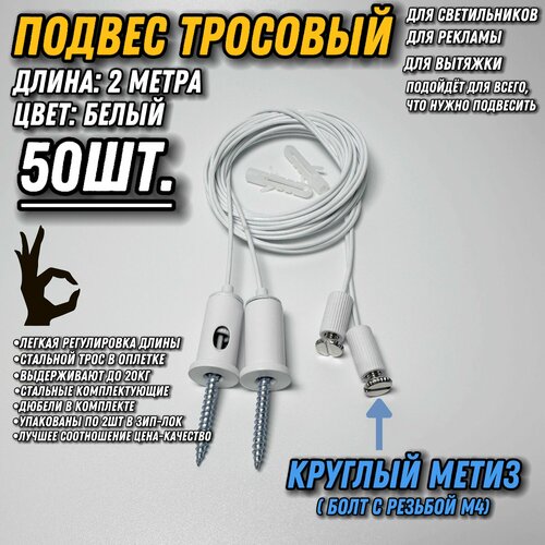 Подвес тросовый регулируемый 2метра/50шт/белый/круглый метиз. Монтажное крепление стальное для светильников, рекламы, вытяжки, шинопровода, треков: сравнение цен, характеристики, фото, актуальное наличие и цены.