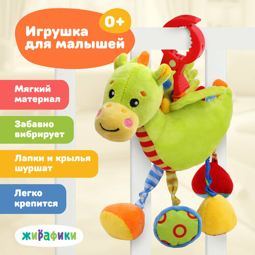 Подвеска с вибрацией «Дракончик» станет одной из первых и самых любимых игрушек малыша! Красочная игрушка сделана из тканей разного цвета и разной фактуры для развития тактильных ощущений ребёнка. Благодаря удобной прищепке игрушку можно легко прикрепить к бортику детской кроватки, коляске или автокреслу.