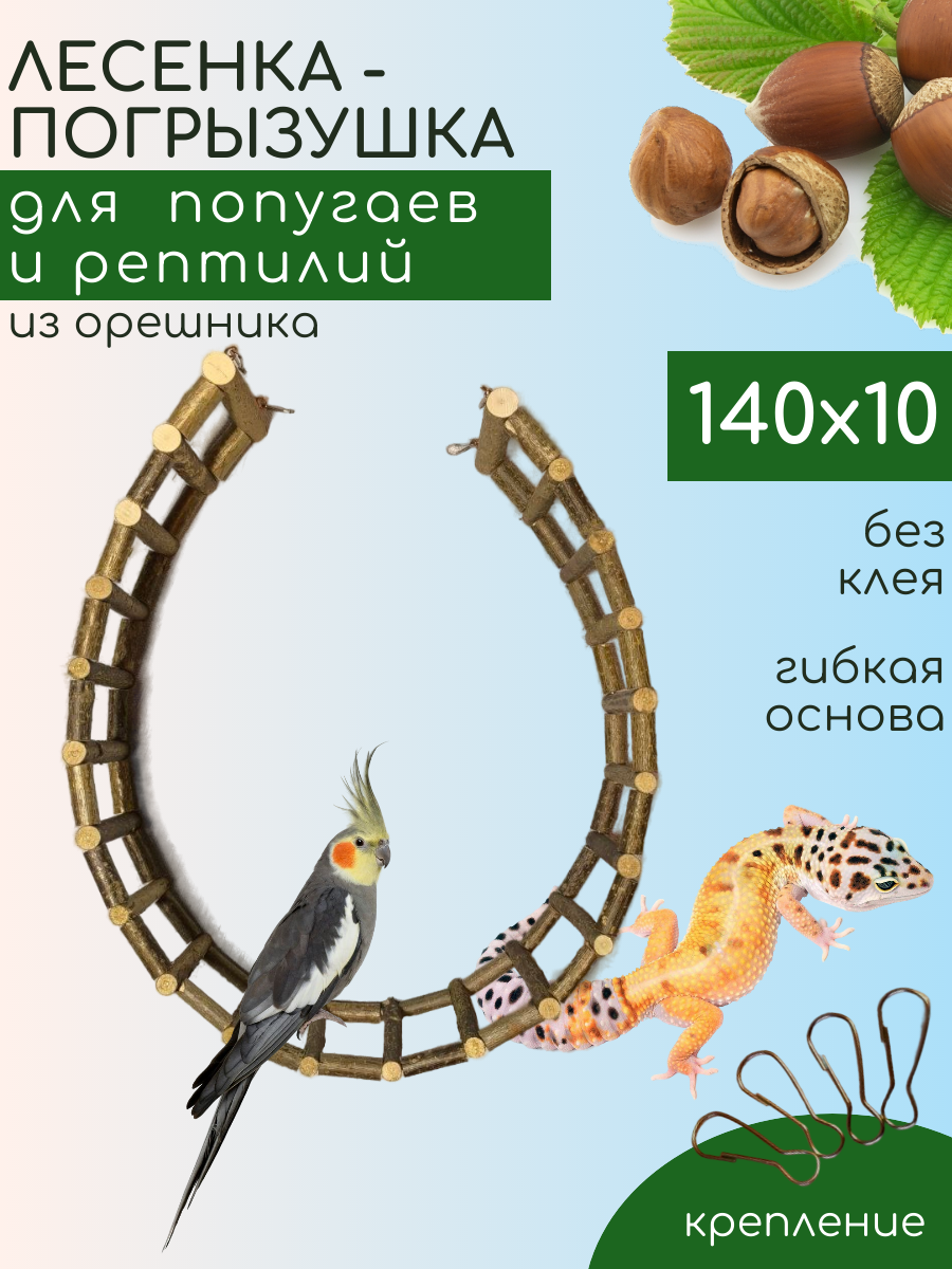 Лесенка полностью сделана из орешника, безопасного для попугаев и птиц. Длина лесенки может быть чуть больше заявленного в карточке. Не содержит клей.