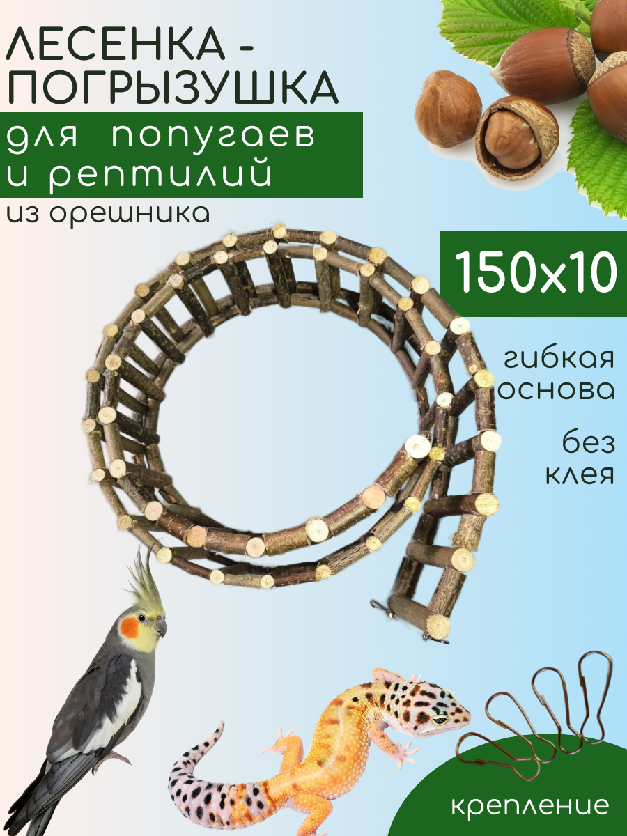 Лесенка полностью сделана из орешника, безопасного для попугаев и птиц. Длина лесенки может быть чуть больше заявленного в карточке. Не содержит клей.