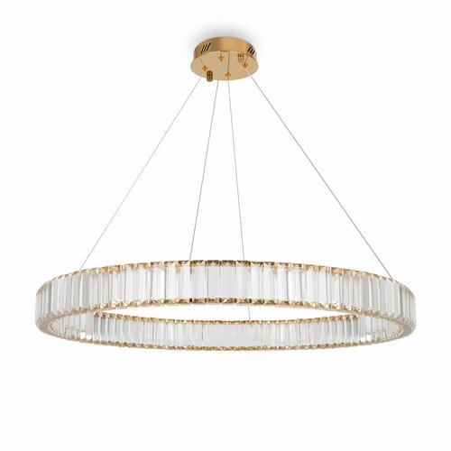 Металлическая арматура в цвете латунь и хром. Хрустальные декоративные кольца с геометричными гранями. LED-источник света. Регулировка цветовой температуры (3000-4000-5000K) и яркости 4G-dimming при помощи пульта (в комплекте).
