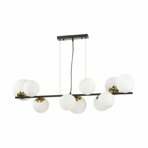 Изготовленная из прочного металла, арматура подчеркивает тщательно продуманный черный цвет, который легко интегрируется в различные интерьерные решения. Десять белых стеклянных плафонов в форме сферы придают светильнику неповторимую изысканность и создают приятное рассеянное освещение в помещении.