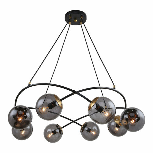 Люстра выполнена из прочного металла, что гарантирует долговечность и надежность в использовании. Основание люстры окрашено в черный цвет с бронзовым оттенком, что придает ей элегантный и современный вид.