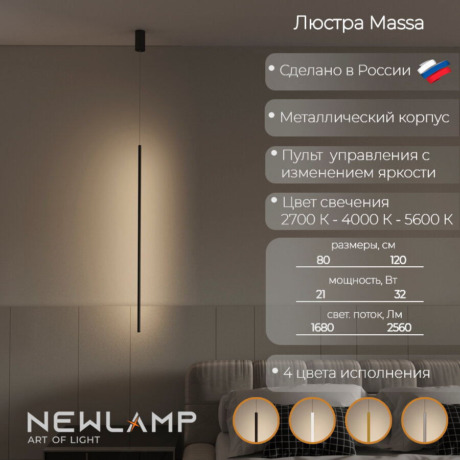 Подвесная люстра в стиле лофт Massa Line – современное решение интерьера для разноуровневой подсветки и точечных световых акцентов, как дополнительный источник света. Светильник прекрасно выделит обеденную зону, барную стойку, рабочий стол. Универсальная потолочная люстра для дома современного дизайна подходит для спальни, гостиной и кабинета. Линейный светильник Massa Line оснащен системой регулировки высоты подвеса, позволяющей размещать изделие на разных уровнях(до 100 см). Дополнительным преимуществом является возможность диммирования света с помощью пульта ДУ. Вы сможете легко регулировать яркость освещения в зависимости от настроения и потребностей. Модель подходит для натяжных потолков. Люстра потолочная светодиодная изготовлена из прочных и качественных, надежных материалов. Порошковая покраска создает фактурное покрытие и обеспечивает лучшие эксплуатационные свойства, чем обычное окрашивание. Это покрытие более устойчиво к сколам, царапинам, другому износу. Этот прямой подвесной светильник представлен в 4 цветах: черный, белый, бронза, серебро. И имеет два размера: 80 и 120 см. Цветность - 4000к дневной свет Компания NewLamp осуществляет постоянный контроль качества поставляемой продукции, поэтому наши светильники и торшеры полностью соответствует заявленным параметром и имеют продолжительный срок службы.