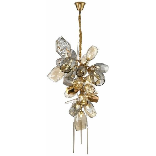 Люстра выполнена из металла и стекла, что обеспечивает прочность и долговечность конструкции. Цвет арматуры и плафонов - бронзовый, что придает изделию особый шарм и элегантность.