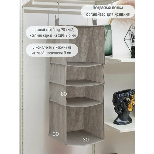Подвесная полка-органайзер для хранения размером 80х30х30 см выполнена из спанбонда плотностью 70 г/м2. Одним из главных преимуществ этой полки является её каркас, выполненный из ХДФ толщиной 2,5 мм. Этот материал обеспечивает прочность и устойчивость конструкции, что позволяет хранить на полке различные предметы без опасений за её целостность. В комплекте с полкой идут два крючка для удобного подвешивания, что делает установку простой и быстрой. Вы также можете комбинировать ее с коробами InterStellar (148964771, 178716765, 209329444), которые прекрасно дополнят ваш интерьер и помогут организовать хранение еще более эффективно. Обратите внимание, что короба в комплект не входят и приобретаются отдельно! Подвесная полка-органайзер — это идеальное решение для оптимизации пространства и создания порядка в вашем доме. Она прекрасно впишется в любую комнату, будь то кухня, спальня, детская или прихожая. Для изготовления продукции InterStellar используются только качественные материалы. Спанбонд обладает высокой прочностью и эластичностью, а также не требует особого ухода. Он изготовлен из специальных синтетических волокон, которые обеспечивают долговечность и устойчивость к истиранию. Благодаря хорошей воздухопроницаемости, спанбонд позволяет ткани "дышать", сохраняя свежесть вещей.