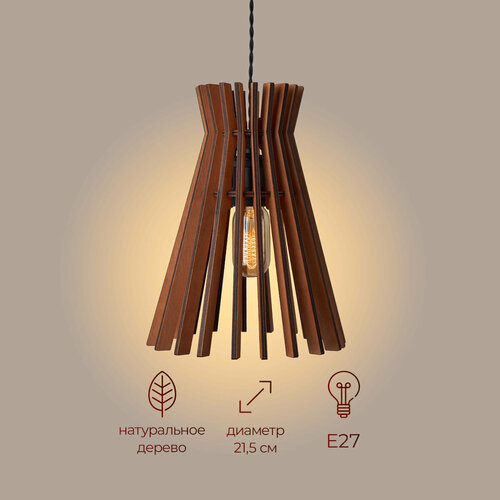 Потолочный светильник изготовлен из натурального, экологически чистого дерева — березы, Используется покрытие высокого качества, не имеющее запаха, и обладающее гипоаллергенными свойствами, что обеспечивает долгий срок службы и комфорт, Деревянный плафон имеет следующие габаритные размеры: диаметр 21,5 см; высота 31 см, Люстра поставляется в собранном виде, а значит вам не понадобится изучать сложные схемы и тратить время на сборку, На плафон уже установлен провод с металлическим патроном E27, совместимый с большинством доступных лампочек, Длина подвеса может регулироваться от 10 см до 1м, Вся фурнитура исполнена в стильном черном цвете, патрон имеет матовое черное покрытие, а провод имеет тканевую оплетку, Повесить люстру не составит труда, в комплекте уже предусмотрена планка для размещения как на обычном, так и на натяжном потолке, Площадь освещения до 15 кв, м, Яркость будет зависеть от установленной лампочки, мы рекомендуем использовать светодиодные лампы или лампы Эдисона, С небольшой по мощности лампой может использоваться как ночник, а с яркой как основное освещение, Обратите, пожалуйста, внимание, лампочка в комплект не входит,