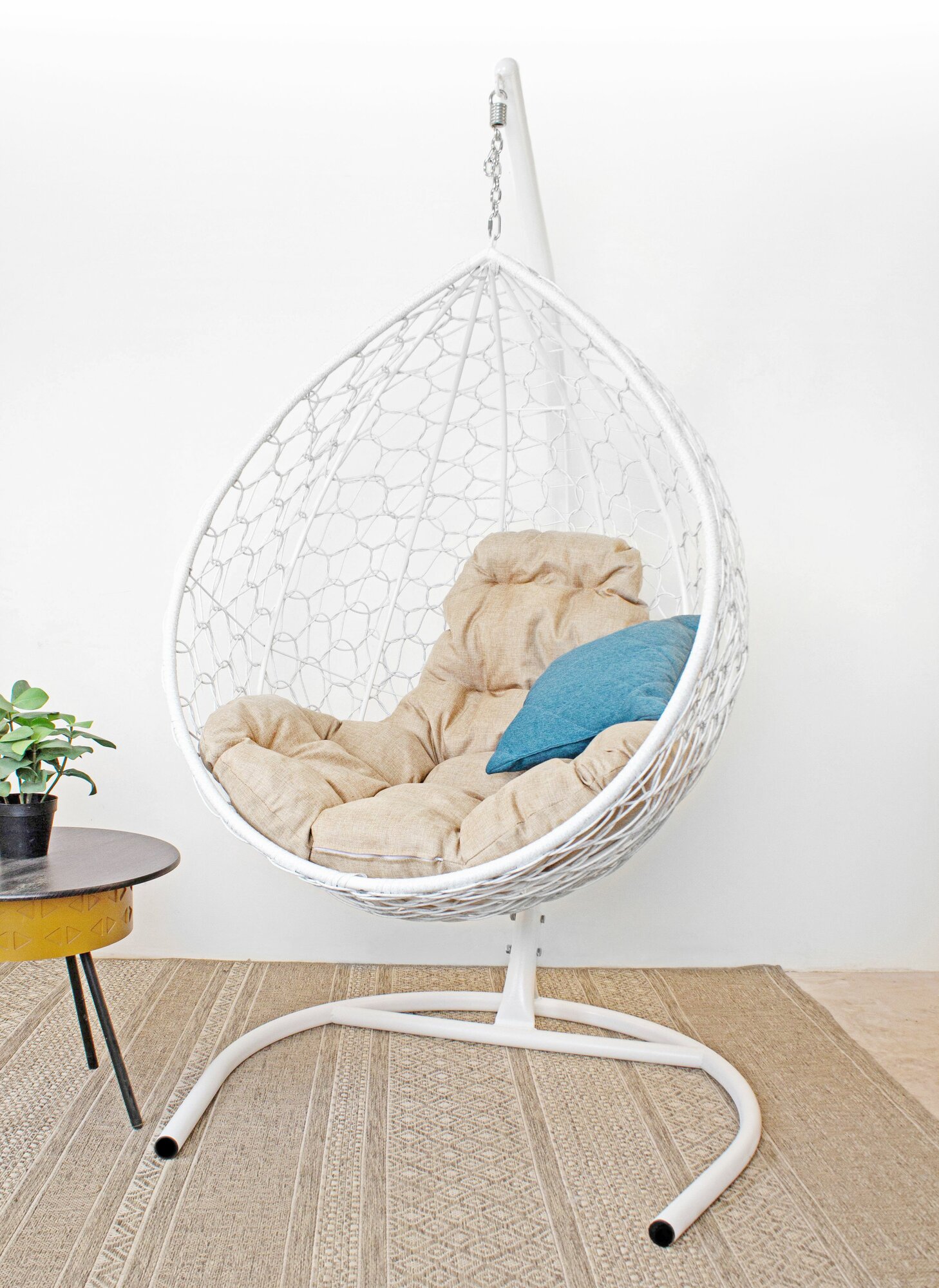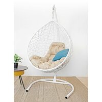 Подвесное кресло капля (без стойки), с ротангом белое, бежевая подушка