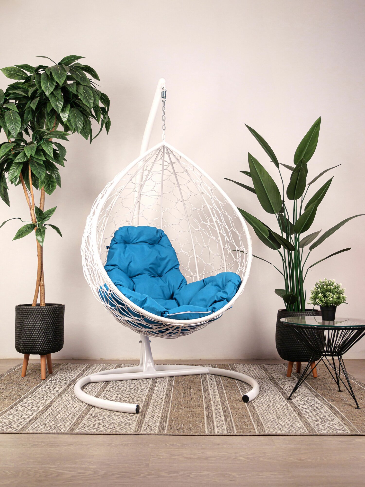 Купить Подвесное кресло капля, с ротангом белое, голубая подушка с доставкой по всей России.
