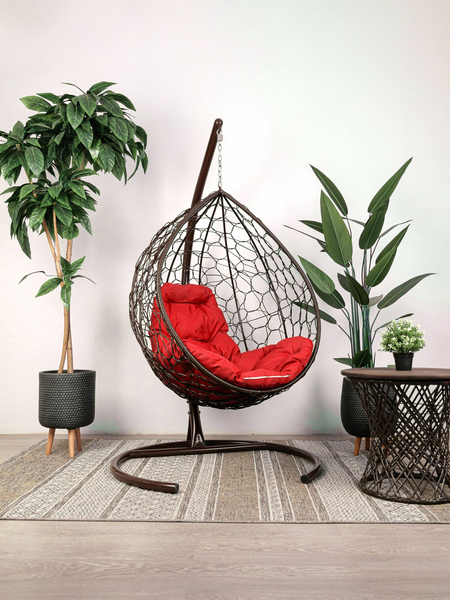 Подвесное кресло капля, с ротангом коричневое, красная подушка: сравнение цен, характеристики, фото, актуальное наличие и цены.