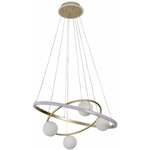 Люстра выполнена в современном стиле хай-тек, который сочетает в себе металл и стекло. Арматура люстры выполнена из акрила и металла, а плафоны - из стекла и акрила. Цвет арматуры - золотой, а плафоны имеют белый цвет.