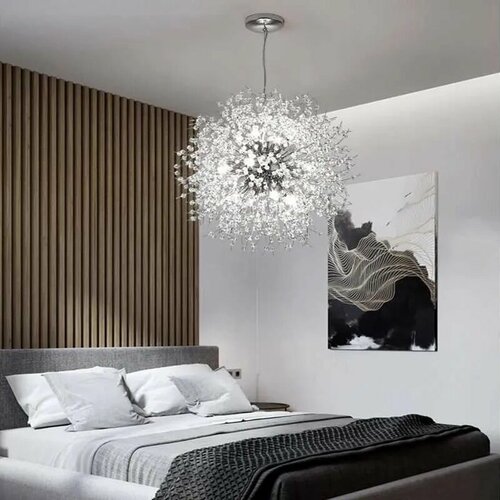 Подвесной светодиодный светильник "Одуванчик" - это современное и стильное решение для освещения вашего дома. Он выполнен в форме хромированной арматуры с 84 ветками, каждая из которых украшена 6 кристаллами. Люстра имеет 16 лампочек G9, что обеспечивает яркое и равномерное освещение. Лампочки в комплекте не идут.