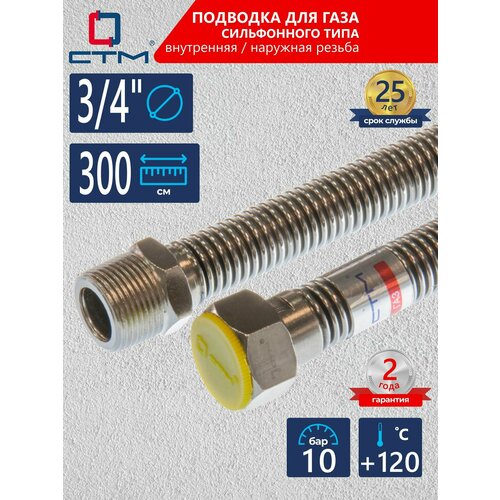 Подводка для газа сильфонного типа для газа 3/4" г/ш 300 см CTM ГАЗ с внутренней/наружной резьбой предназначена для подключения приборов бытового (газовые плиты, колонки, котлы) и промышленного назначения к газовым магистралям Толщина стенки рукава составляет не менее 0,2 мм, что исключает нагрев подводки от блуждающих токов и обеспечивает отличную прочность. Идеальная геометрия спиралей обеспечивает одинаковую толщину на всех участках. Внутреннее сечение подводки не сужается и поэтому давление перед устройством не снижается, что особенно важно для газового оборудования. При установке подводки сильфонного типа для газа концевую арматуру необходимо затягивать с усилием не более 4 Нм Срок службы до 25 лет.