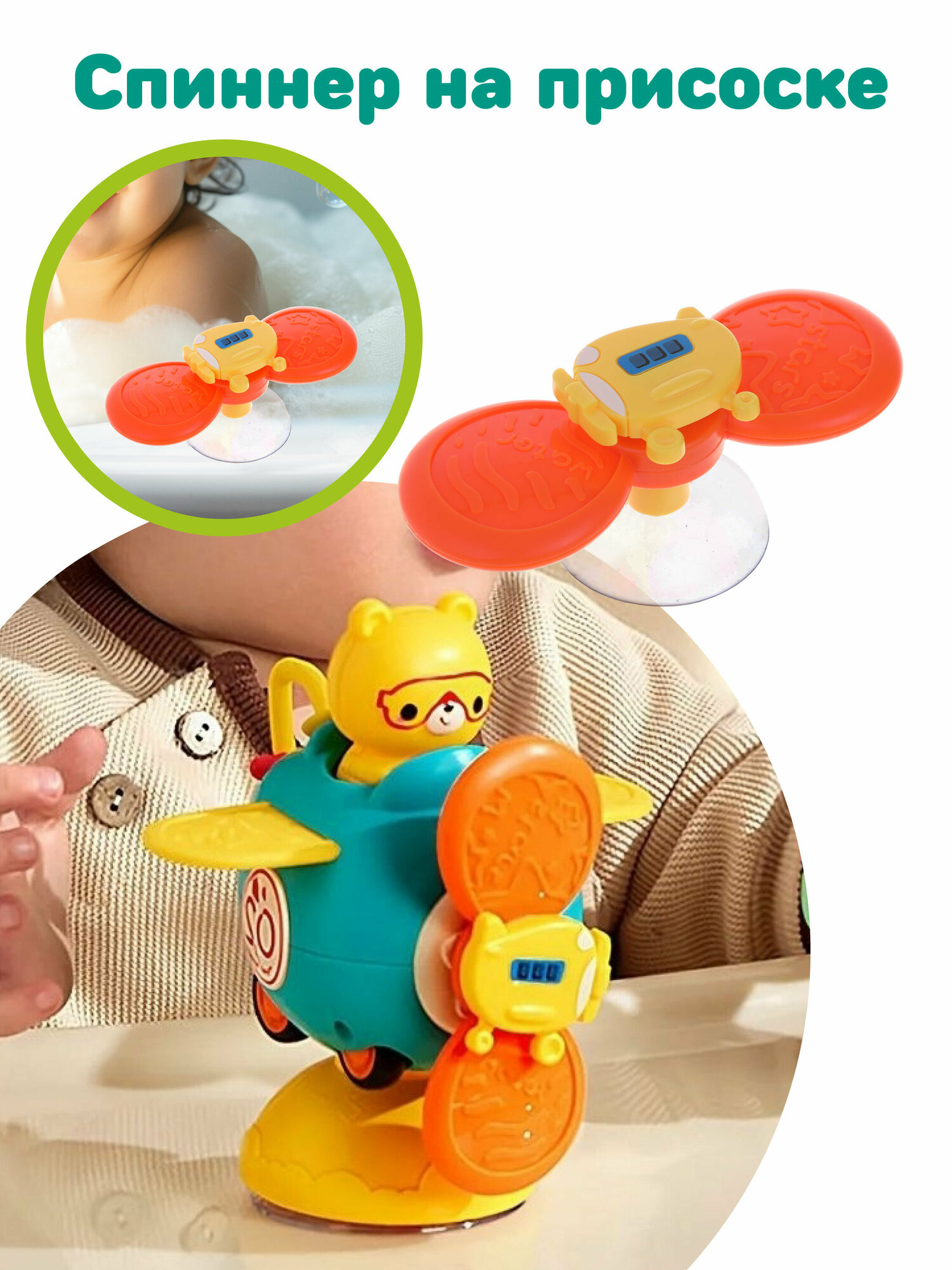 Если убрать присоску, то получится игрушка-каталка на колесиках. А если открутить лопасти и прикрепить к ним пластиковое основание, то у вас уже будет спиннер, который также можно установить на присоску.