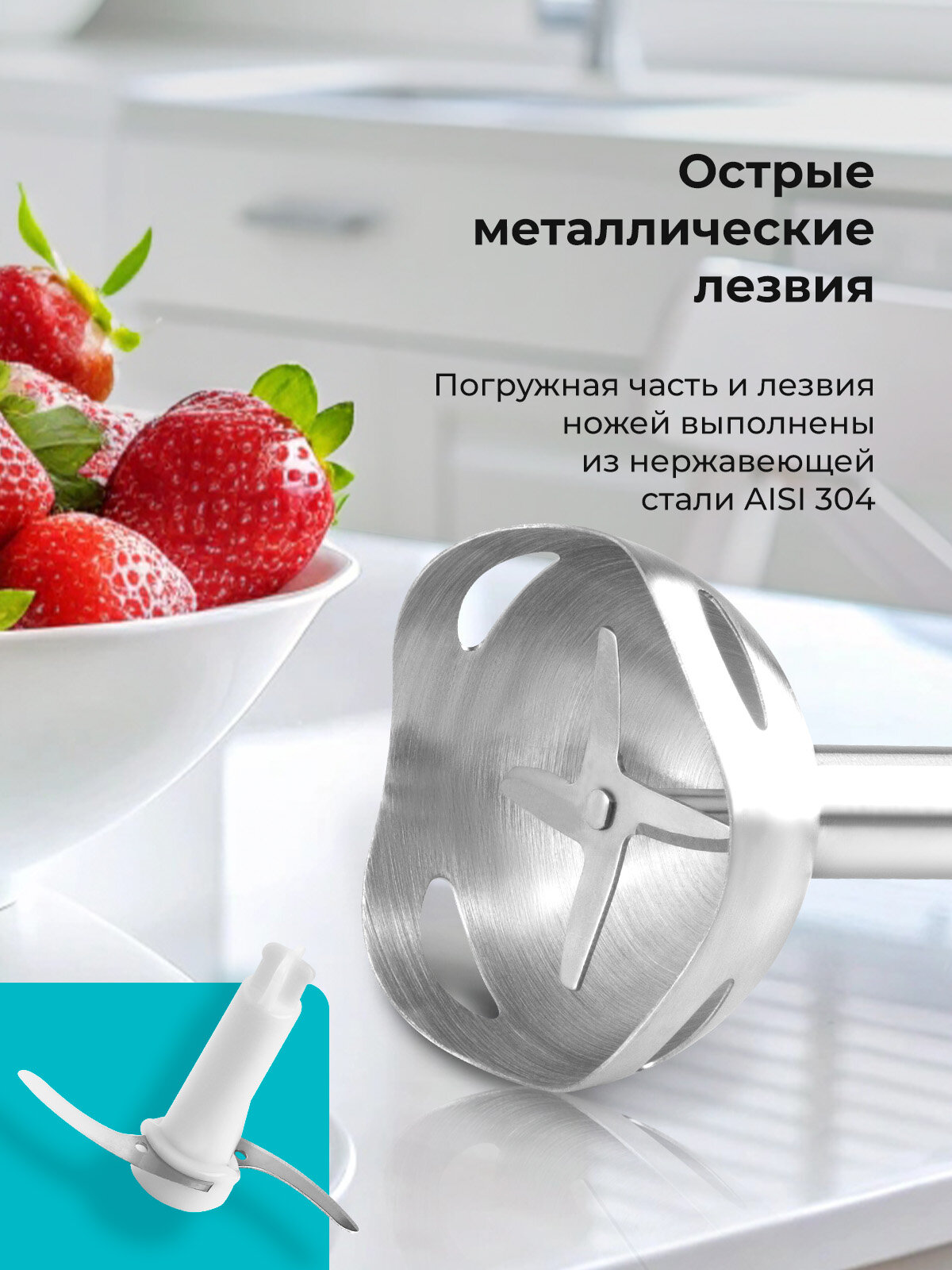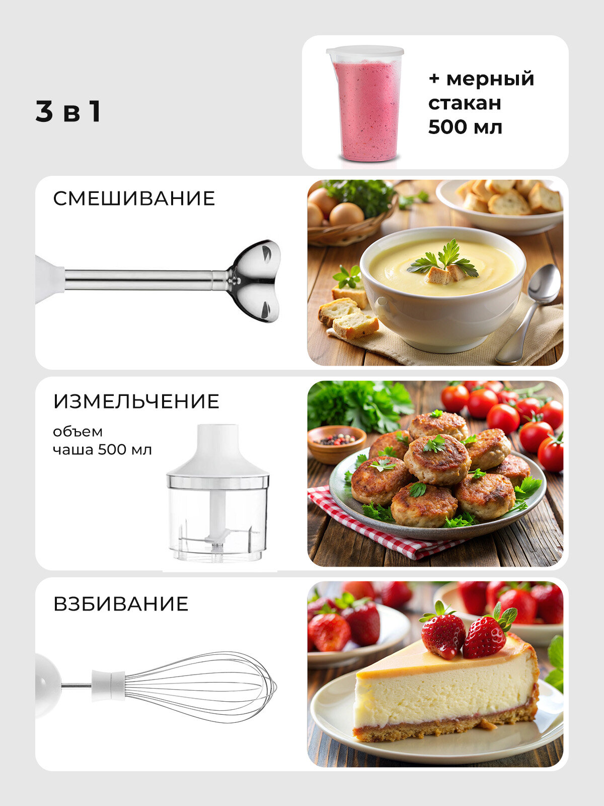 | Насадки | венчик для взбивания, для замешивания теста, для приготовления пюре, измельчитель, мельничка |