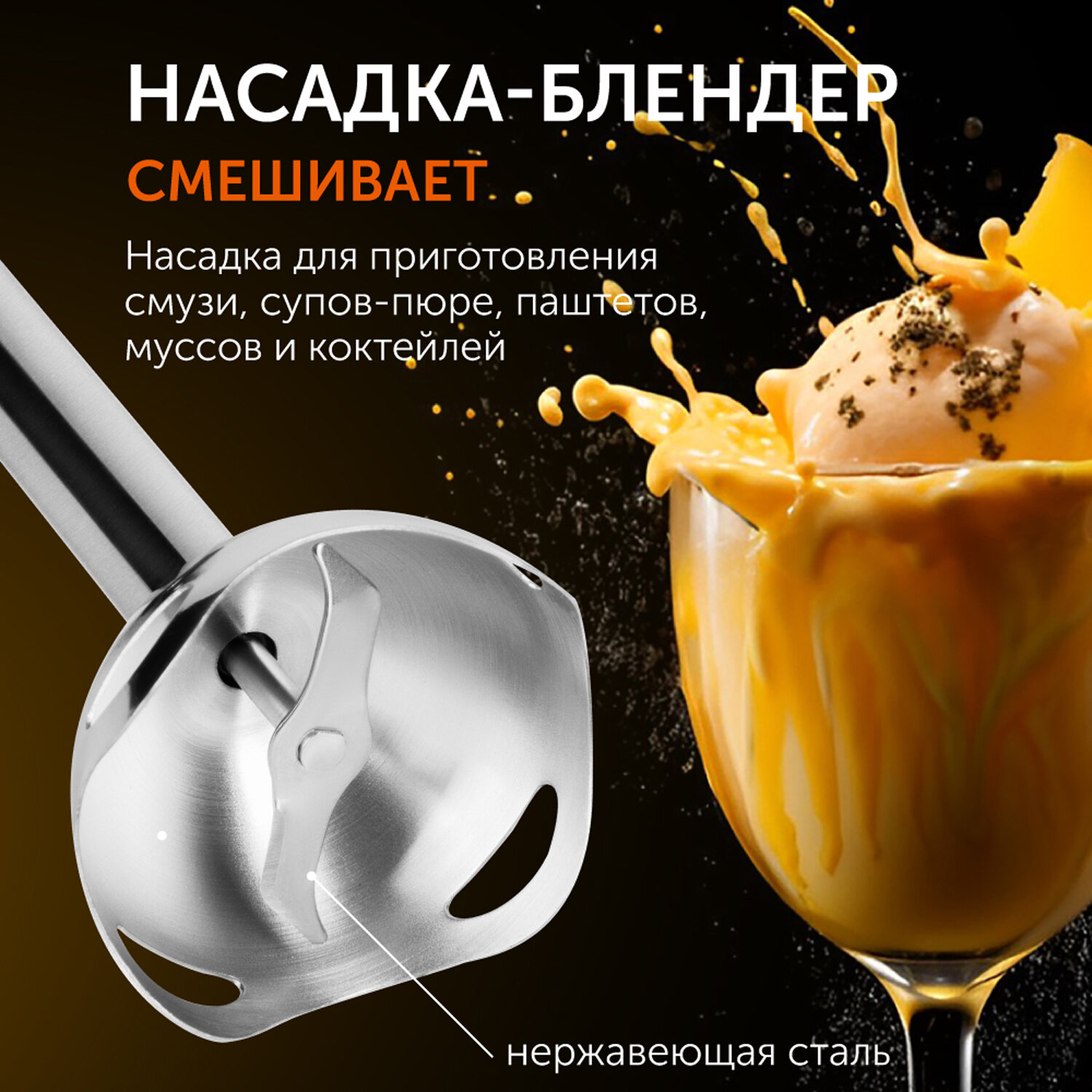 | Дополнительная информация | Комплектация блок электродвигателя, чаша измельчителя с крышкой, S-образный нож измельчителя, насадка-блендер, насадка-венчик, переходник для насадки венчика, стакан для смешивания, руководство по эксплуатации |