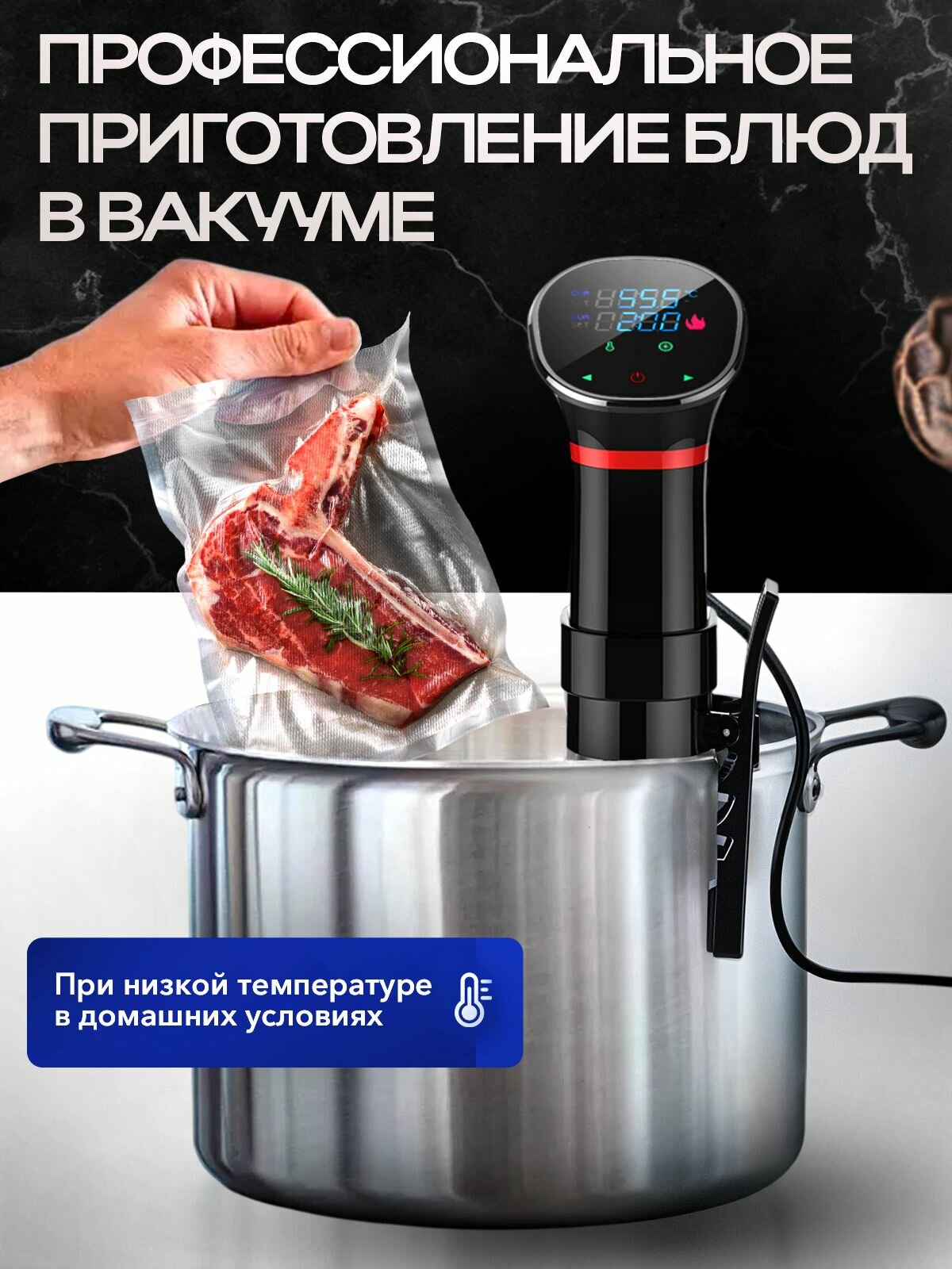 Су-вид - это искусство приготовления, которое позволяет достичь идеальной готовности мяса, рыбы, морепродуктов и овощей. Стационарный погружной термостат обеспечит стабильную температуру во время всего процесса приготовления. Под вакуумом продукты сохраняют свою сочность и аромат, а медленноварка позволяет им равномерно пропитаться специями и маринадами.