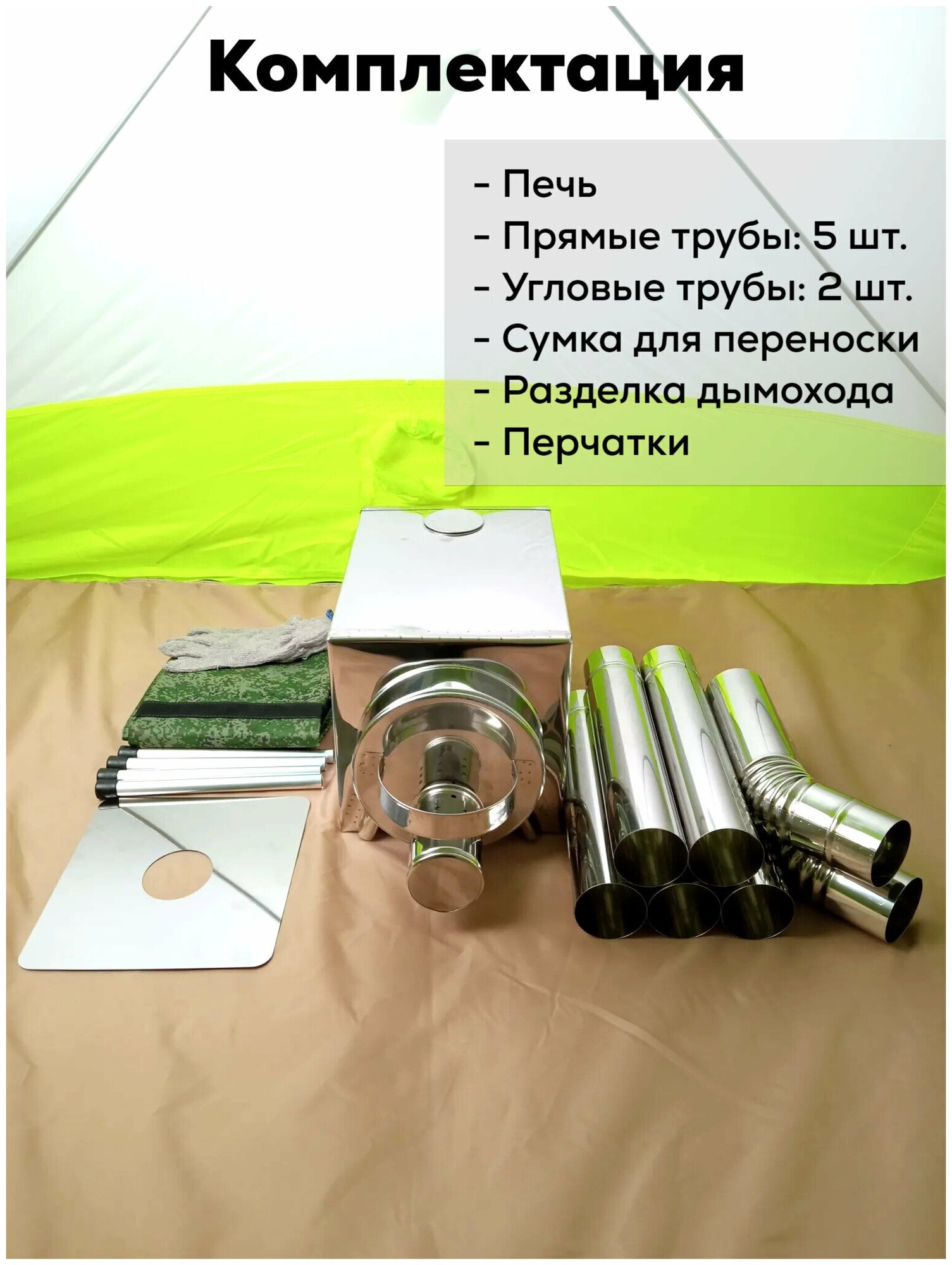 Все сегменты дымохода туристической печи укладываются внутрь топки. Время эффективного обогрева на одной закладке до 4 часов.