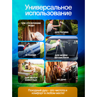Портативный душ от компании ТЕХНАРЁВ станет отличным помощником в самых разных ситуациях. Наш походный душ имеет встроенный аккумулятор, обеспечивающий от 30 до 40 минут непрерывной работы без подзарядки. Заряжается от разъема USB(провод входит в комплект). Все, что Вам понадобится это вода и емкость для воды. Душ для дачи по достоинству оценили владельцы приусадебных участков и успешно применяют их для полива. Душ для дальнобойщика выручает мужчин этой непростой профессии в дороге. Любители братьев наших меньших оценили удобство нашего туристического душа при мытье животных. Душ для кемпинга стал незаменим у любителей проводить время на природе, у моря или в лесу. Походный душ имеет небольшие габариты, а вес его составляет всего 800гр, поэтому подойдет для любых путешествий и не займет много места в рюкзаке. А автолюбители используют его, для мойки автомобиля, для этого в комплекте имеется струйная насадка. Летний душ от компании ТЕХНАРЁВ выполнен из современных, качественных материалов, не имеет посторонних технических запахов. В комплект душа для дачи входят крепления для лейки: присоска, для крепления на гладкой поверхности, и крючки с помощью которых, душ можно закрепить за что угодно.
