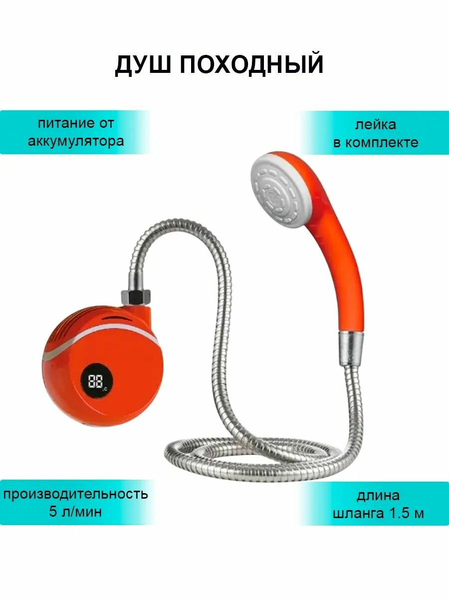Походный душ — это незаменимый атрибут для комфортного отдыха на природе. Компактный и легкий, он легко поместится в рюкзак и позволит вам освежиться после активного дня, где бы вы ни находились. Насос с удобной лейкой обеспечивает мощную струю воды, а прочный шланг достаточной длины даёт свободу движений. Комплект включает все необходимое для установки и использования: насос, лейку, шланг, крепления, кабель зарядки и инструкцию. Простота в использовании: благодаря простому дизайну этот душ прост в использовании. Просто подключите его к источнику воды, включите и наслаждайтесь освежающим душем. Изготовлен из высококачественных материалов, выдерживает суровые условия использования на открытом воздухе. Он создан для длительного использования, гарантируя, что вы получите максимальную отдачу от своих денег. Универсальное использование: отправляетесь ли вы в поход в лес или отправляетесь на пляж, этот душ достаточно универсален, чтобы удовлетворить ваши потребности. Питание: от аккумулятораЕмкость аккумулятора: 2000 мАчЗарядка: 4-5 чАвтономная работа: до 60 минМатериал корпуса: пластикС дисплеемПроизводительность 5 литров в минутуДлина шланга: 1,5 м
