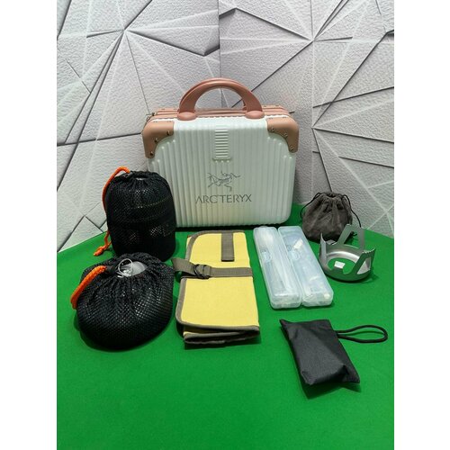В набор входит: 1. Дорожная ручная сумка из АБС-пластика (длина- 30см, высота 25 см, ширина 15см). 2. Набор столовых приборов в чехле на липучке (вилка, ложка, нож). 3. 2 набора столовых приборов в футляре (вилка, ложка, палочки для еды, держатель для приборов). 4. Туристический чайник 0,8 л в чехле (14 см х 8 см). 5. Спиртовая плита 360 ° горения для использования на открытом воздухе с подставкой. 6. Антипригарная кастрюля для приготовления 0,8 л (17 см х 10,5 см) в чехле. 7. Сумка для хранения столовых приборов.