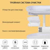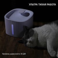 Преимущества поилки фонтана: * Объем 3 литра; * Самый тихий мотор; * Индикатор уровня воды; * Многоразовый фильтр; * Устойчивость к опрокидыванию; * Насыщение воды кислородом; * Низкое потребление энергии; * Питание от сети через адаптер usb (Пожалуйста, не используйте адаптер питания мощнее 1 ампера, моторчик может сгореть); * Возможно подключение к Power bank (не входит в комплект). Работа от полного заряда банка на 10000мАh ~ 43 часа; * Размер В15,2 x Ш19,5 x Г19,5 см.