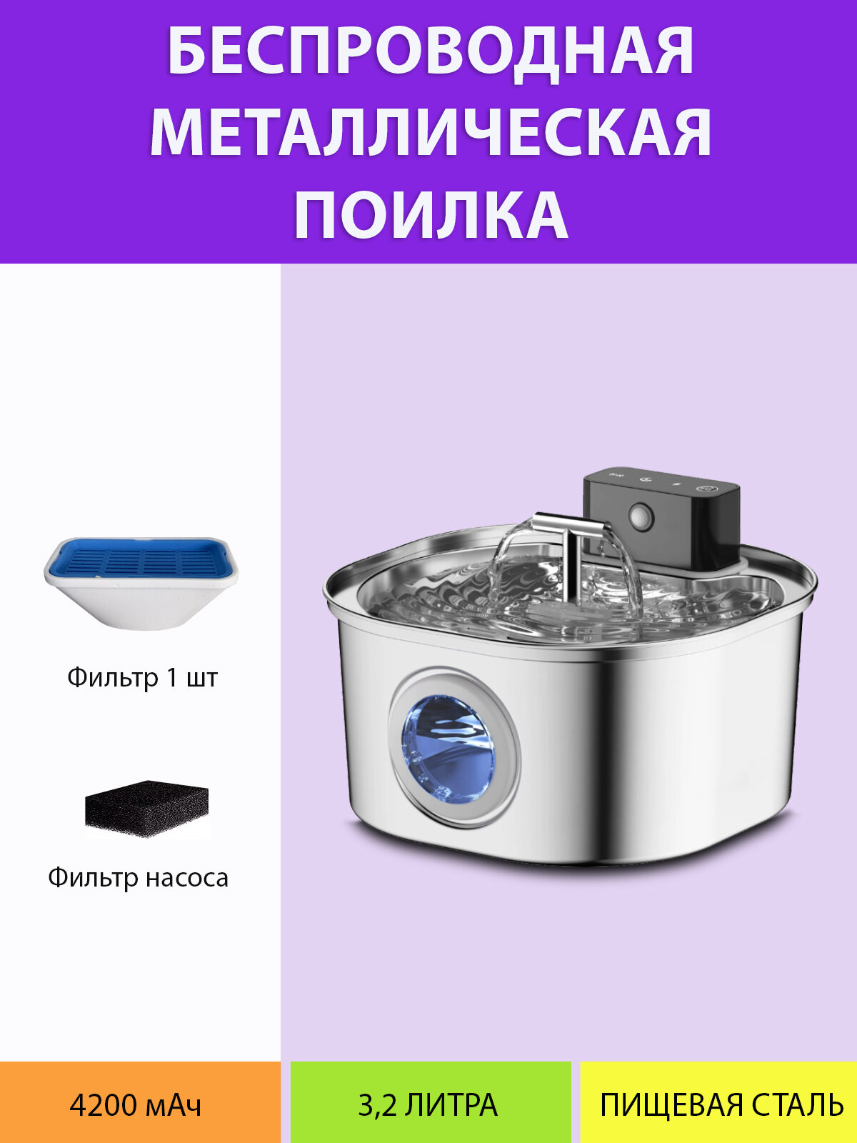 Поилка автоматическая металлическая беспроводная с датчиком движения, квадратной формы, с краном, на аккумуляторе для кошек и собак 4200 мАч, 3,2 литра MY PET`S GADGETS: сравнение цен, характеристики, фото, актуальное наличие и цены.