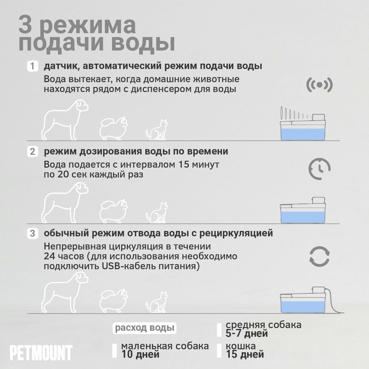 Беспроводная поилка для собак и кошек от PETMOUNT это новинка 2024 года с возможностью контроля уровня воды, датчиком движения и гарантией на устройство 1 год. Благодаря беспроводной батарее и бесшумной работе, эта поилка станет идеальным решением для ваших любимых питомцев. Инфракрасный датчик движения активирует подачу воды, когда животное приближается, а когда животное отходит от поилки подача воды прекращается. Автопоилка PETMOUNT оснащена датчиком движения с радиусом действия 2 метра и углом обнаружения 270 градусов. Автоматическая поилка для животных оборудована многоступенчатой системой фильтрации для очистки жидкости, что обеспечивает здоровье Вашего любимца. В комплекте вы уже найдете два фильтра для использования. Перед использованием необходимо ознакомиться с инструкцией и промыть поилку водой. Не забывайте регулярно менять воду чистить резервуар и фонтан без проводов прослужит долго.