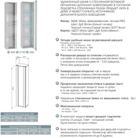 Шкаф выполнен в современном стиле и имеет размеры 400 x 1700 x 290 мм. Корпус изготовлен из ЛДСП толщиной 16 мм, а фасад - из МДФ в финиш-пленке ПВХ и стекла толщиной 4 мм. Дверца шкафа оснащена прозрачным элементом из стекла, что позволяет любоваться содержимым, при этом защищая его от пыли и влаги.