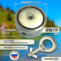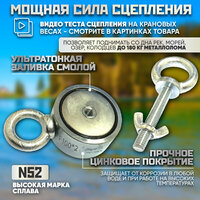 Диаметр 58 мм. Толщина 24 мм. Сцепление до 180 кг (Под углом 90 градусов , при сцеплении по всей поверхности магнита с ровной металлической поверхностью толщиной 15мм. Сила на сдвиг в бок всегда меньше на 30%) Производство Россия Magnet LTD Рым болт M10. Корпус Сталь. Максимальная температура 80 С. Срок размагничивания 1 процент в 10 лет. Вес 840 гр. Материал магнита ndfeb неодим + цинк Покрытие магнита никель. Покрытие корпуса Цинк. Представленный неодимовый магнит имеет массу чуть меньше 1 килограмма. При этом, его удерживающая сила – 180 килограмм. Сгусток неодима, бора и железа принесет своему обладателю немало приятных находок на земле, в воде и даже в строительном мусоре. Комплектация данной модели: Поисковый магнит корпус рым-болты (2 шт) Размагничивание 1 % в 10 лет, не ржавеет.