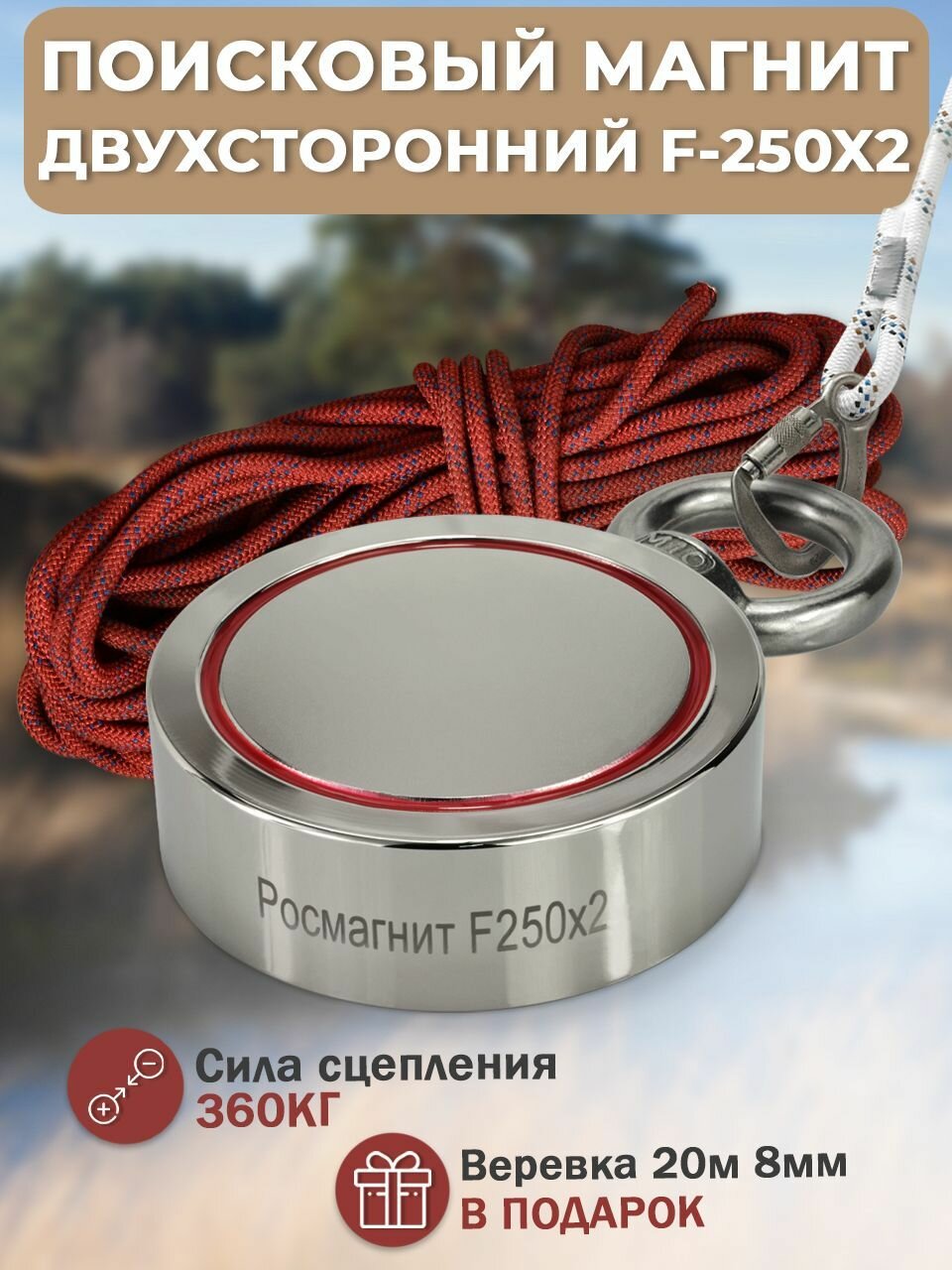 Поисковый магнит двухсторонний Росмагнит F-250х2, сила сц. 360 кг + (веревка 20м 8мм)(тип 2): сравнение цен, характеристики, фото, актуальное наличие и цены.