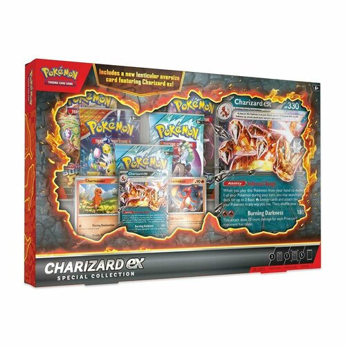 Чаризард Экс приносит Тьму! Чаризард Экс сжигает преимущество противника хитрой огневой мощью покемона типа Тьма! Эволюционируйте его из Чармандера и Чармелеона, а затем используйте его мощную способность и атаку, чтобы сокрушительно отыграться. Этот огненный набор также включает 5 бустеров Pokémon TCG и большую лентикулярную карту с изображением самого огненного покемона — перемещайте карту вперед и назад, чтобы увидеть, как Чаризард Экс атакует!