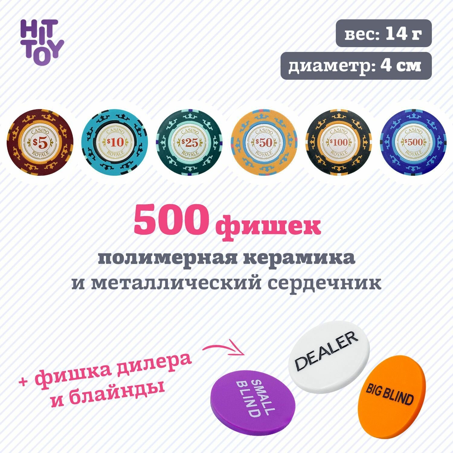 Номиналы фишек 5 (100 шт.), 10 (100 шт.), 25 (100 шт.), 50 (100 шт.), 100 (50 шт.), 500 (50 шт.)