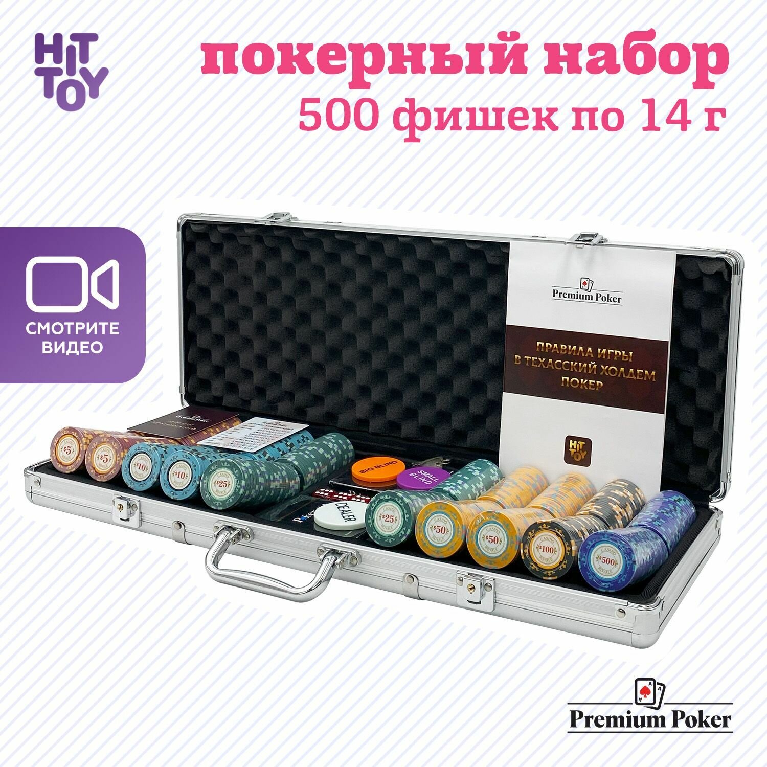 Комплектация игровые фишки - 500 шт, игральные кости - 5 шт, пластиковые карты - 2 колоды по 54 шт, фишка дилера, фишки Big blind и Small Blind, кейс (с замком, 2 ключа), карточки с комбинациями, инструкция
