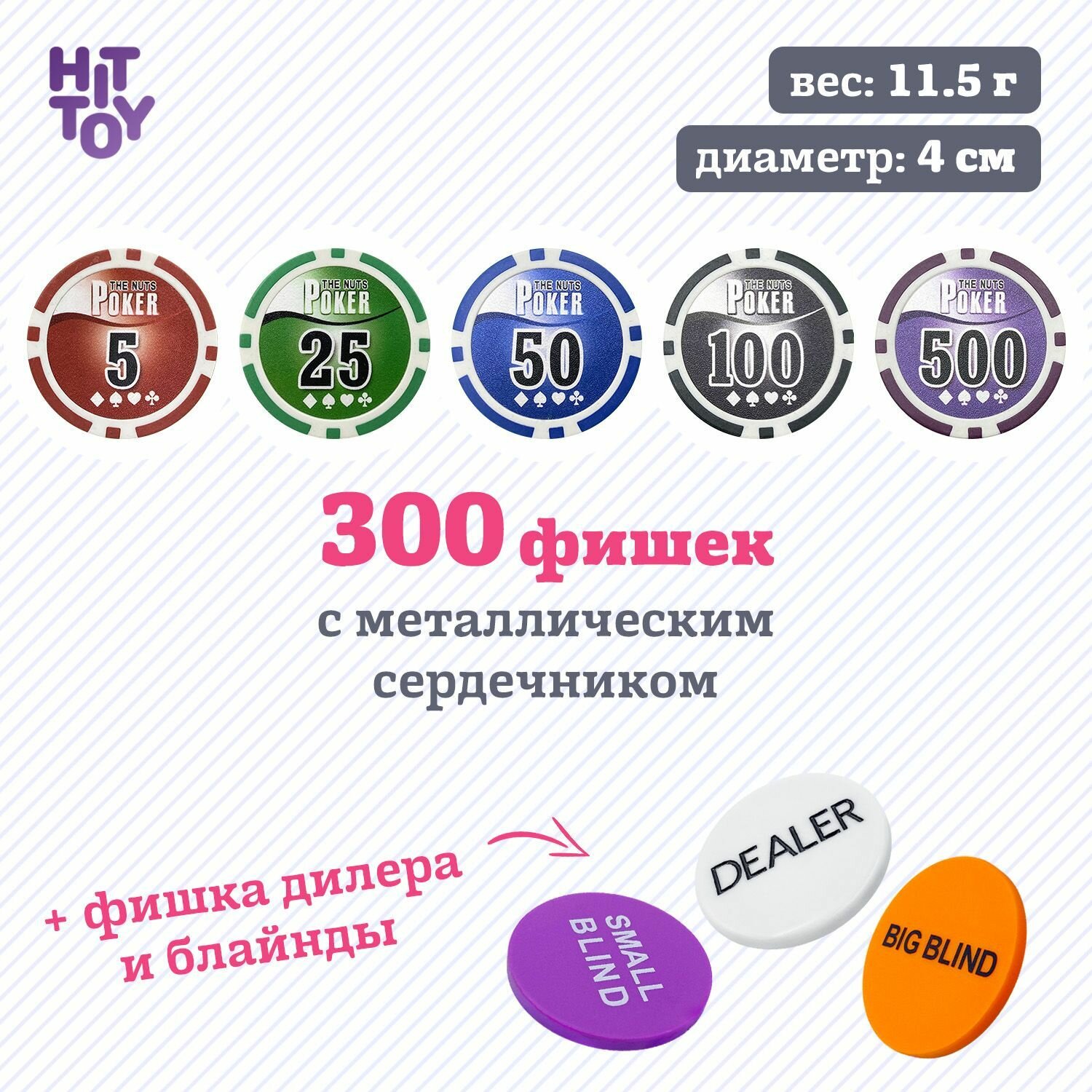 Номиналы фишек 5 (75 шт.), 25 (75 шт.), 50 (50 шт.), 100 (75 шт.), 500 (25 шт.)
