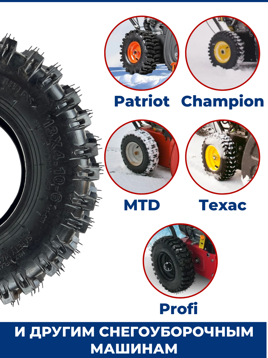 Покрышка 13х4.10-6 - это высококачественная и надежная шина, специально разработанная для использования на снегоуборочных машинах, газонокосилках, садовых дачках и квадроциклах. Ее особенностью является размер 13х4.10-6, который обеспечивает оптимальное сцепление с поверхностью и отличную проходимость на снежных и ледяных дорогах, а так же по сухой и влажной земле. Благодаря своему прочному и износостойкому материалу, покрышка обладает устойчивостью к повреждениям и долгим сроком службы. Безопасность и эффективность работ гарантированы с использованием данной покрышки. Устанавливается на различные модели снегоуборщиков MTD, Champion, Patriot, Profi, Texas, Huter, Master Yard и многие другие снегоуборочные машины. Подойдет для некоторых детских квадрациклов, mini ATV 47cc-49cc и т. д.