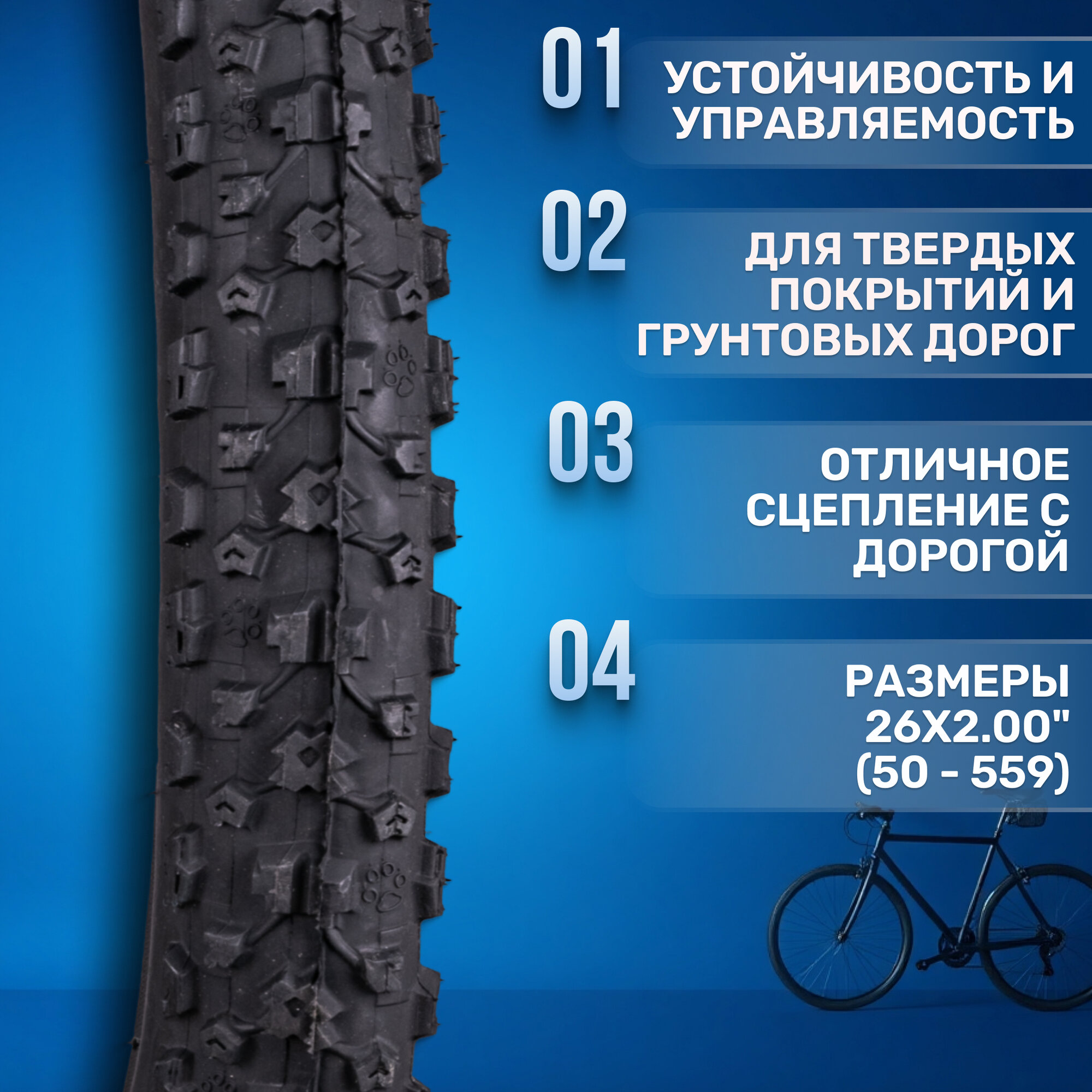 Особенности: - Устойчивость к механическим повреждениям благодаря прочному компаунду. - Универсальность применения: подходит для горных (MTB), дорожных моделей и гибридов. - Эффективное поглощение вибраций при движении по неровностям дороги. - Совместимость с популярными моделями велосипедов со стандартным диаметром обода 26". - Размер ETRTO: 50-559. - Диаметр: 26 дюймов. - Ширина: 2 дюйма