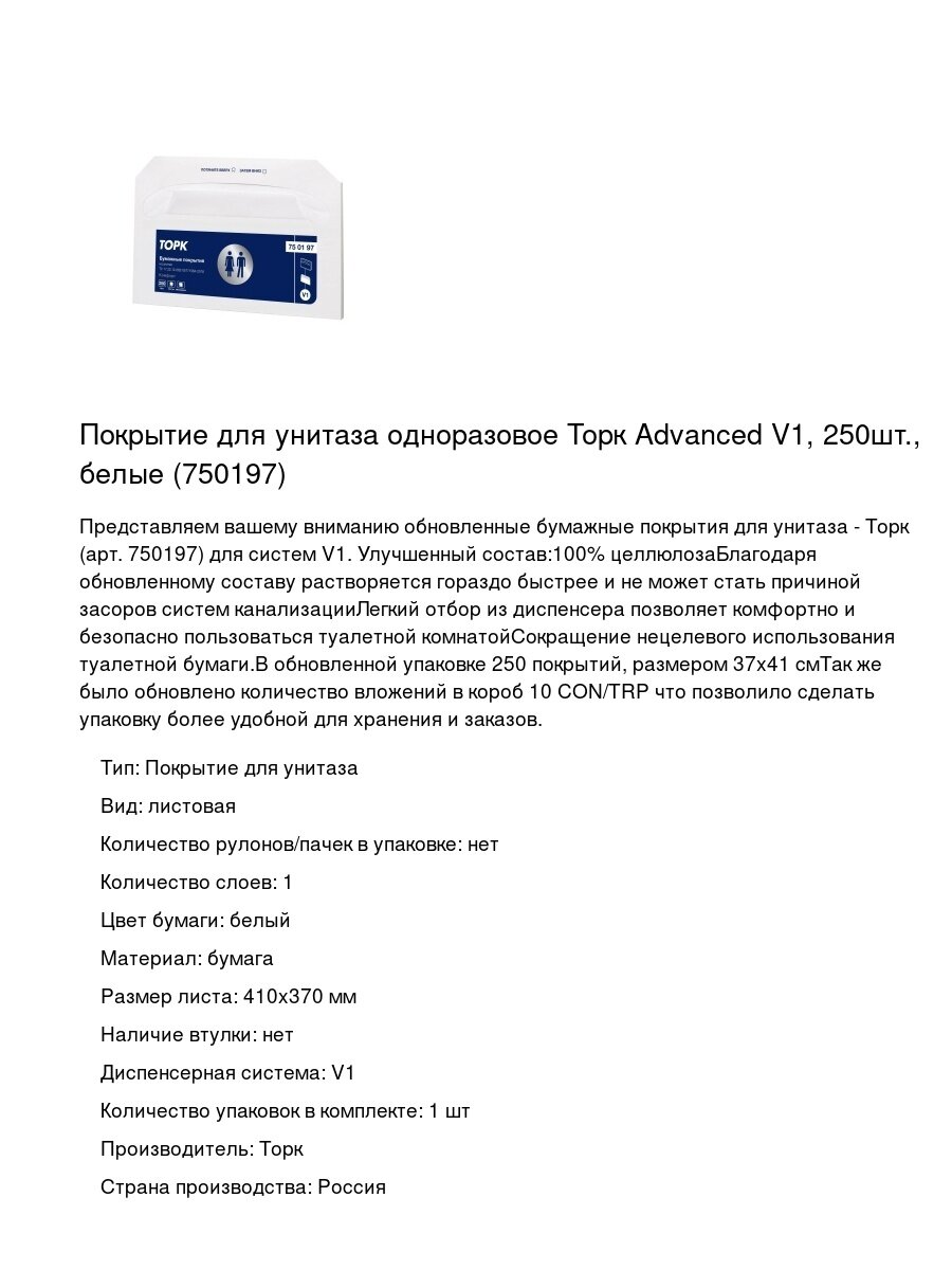 Покрытие для унитаза одноразовое Торк Advanced V1, 250шт, белые (750197): сравнение цен, характеристики, фото, актуальное наличие и цены.