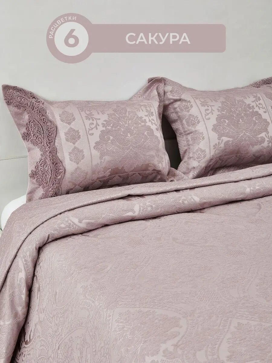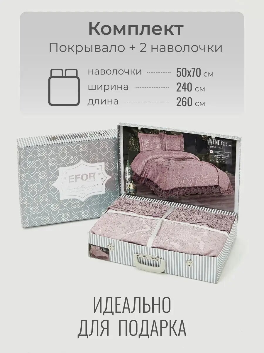 Покрывало выполнено из высококачественного полотна со стильным, изысканным жаккардовым рисунком непревзойдённой красоты. Покрывало очень приятное на ощупь, долго сохраняет яркость цвета и при этом практически не мнется. Состав ткани полиэфирные волокна с добавлением шенилловых нитей. Полотно получается легким, прочным и износостойким, а эстетические качества говорят сами за себя. Шикарное красивое покрывало для ценителей роскошных интерьеров. Размер евро 240х260 (265x275) см, в состав входят две наволочки 50х70 см. Шикарно смотрится в интерьере. Плотность полотна 680 грм. Хорошо ложится на постель, не мнется, не электризуется. В комплект входят две наволочки с воланом для подушек 5070 см, наволочки также декорированы кружевом. Произведено и упаковано в Турции, упаковка жесткая подарочная коробка. Новогодние подарки