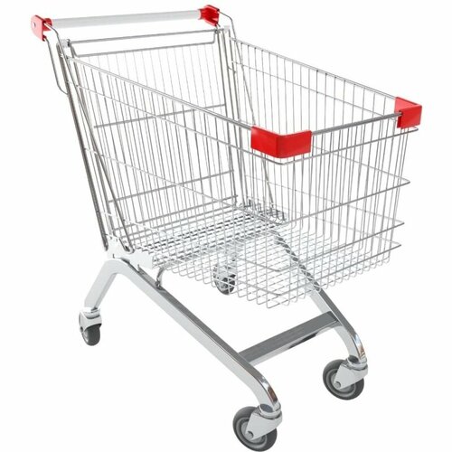 Тележка покупательская 60 л. Без детского сидения. Колеса 100 мм PU. Тележка изготовлена из стали серого цвета. Вставки пластик красного цвета. Возможно комплектация замком - монетницей.