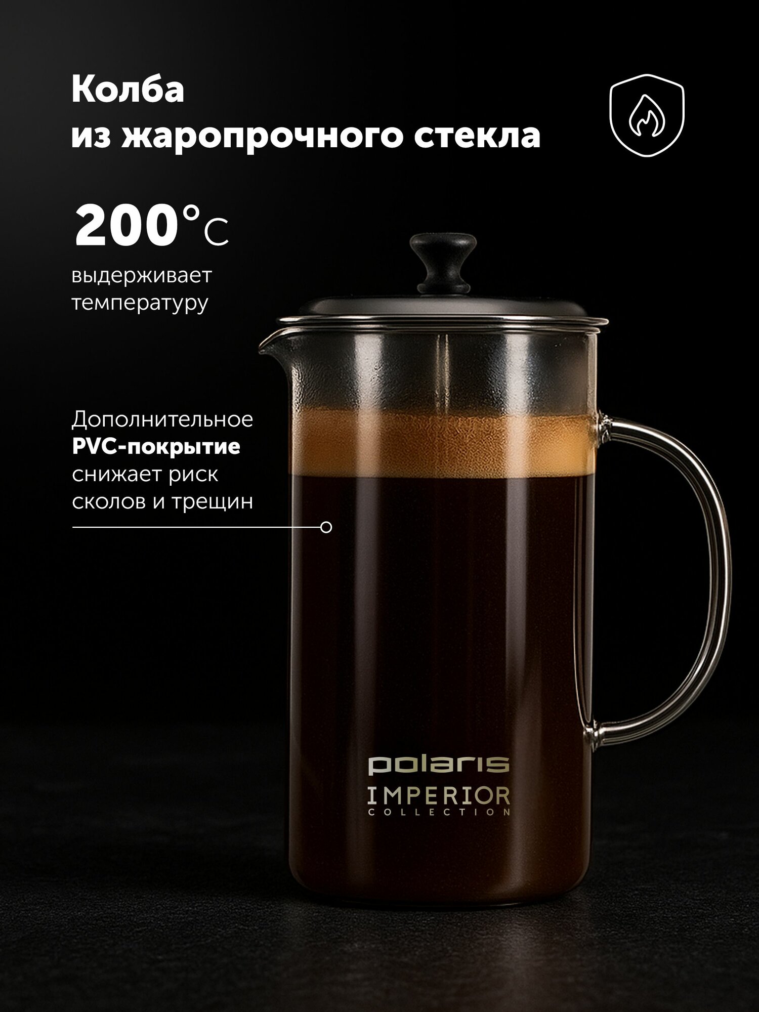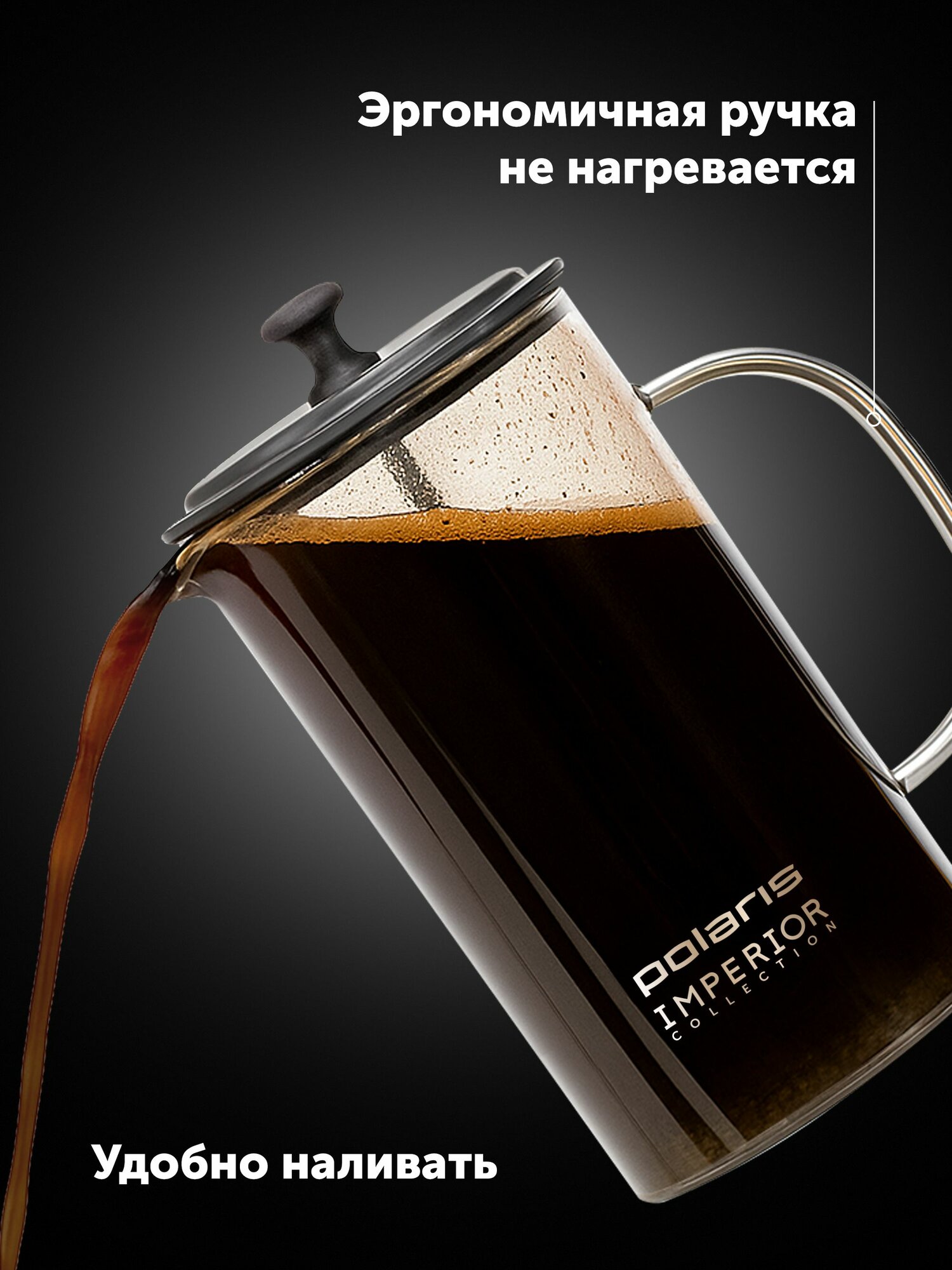 Френч-пресс 1000 мл Polaris Imperior - это идеальный выбор для любителей качественного кофе и чая. Этот профессиональный заварник изготовлен из высококачественного стекла и нержавеющей стали, что обеспечивает долгую службу и удобство использования. Благодаря своей прочности, френч-пресс Polaris Imperior легко выдерживает температурные изменения и не треснет при быстром остывании жидкости. Ручка из нержавеющей стали гарантирует безопасность и комфорт при использовании, так как она не нагревается во время процесса заваривания.