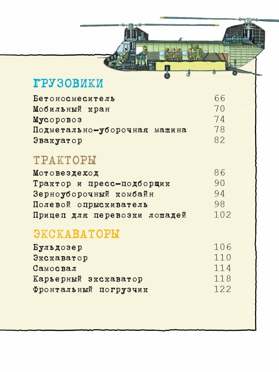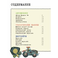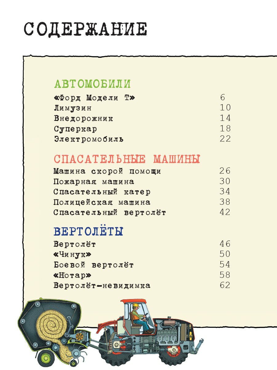 Книга разделена на шесть частей: автомобили, спасательные машины, вертолеты, грузовики, тракторы и экскаваторы. В каждом из них представлены наиболее интересные модели. Дети узнают, как устроены карета скорой помощи, пожарная и полицейская машины, как работает зерноуборочный комбайн, мусоровоз, эвакуатор, почему взлетает вертолет и многое другое.