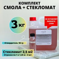 В этом комплекте УЖЕ есть ВСЁ, ЧТО нужно: Смолы 3 кг, Стекломат размером 1,25м х 1 м - 2 шт. и плотностью 300 гр/м2, Отвердителя 90 гр.