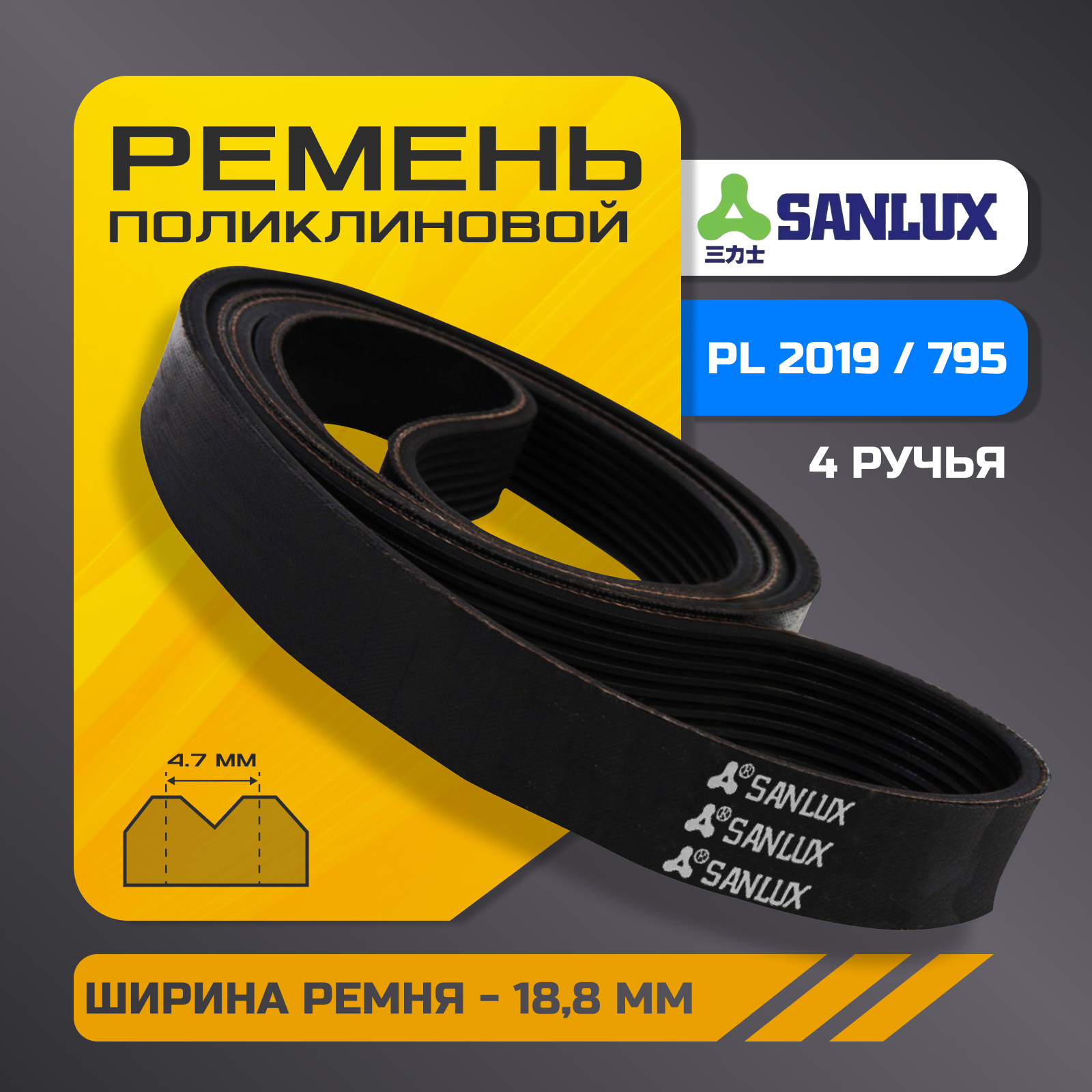 Поликлиновый ремень PL 2019/ 795 L E-POLY-V EPDM, SANLUX, 4 ручья (4PL2019) от SANLUX - это высококачественный продукт, который предназначен для использования в приводах с большими скоростями и малыми диаметрами шкивов.