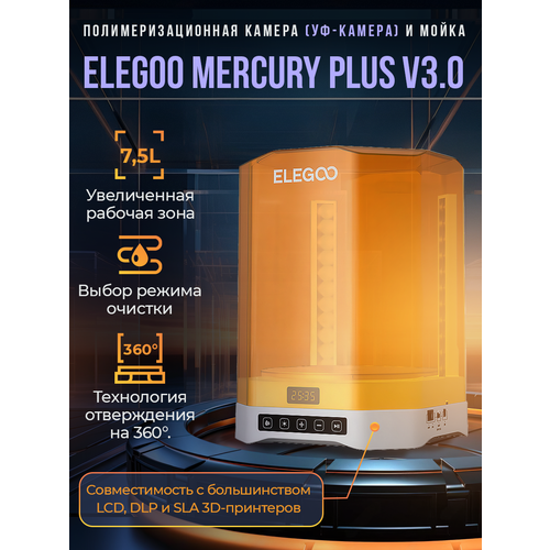 Полимеризационная камера (УФ-камера) и Мойка Elegoo Mercury Plus V3.0 — это усовершенствованное решение для постобработки моделей, созданных на 3D-принтерах. Благодаря увеличенному объему камера позволяет легко очищать и отверждать крупные объекты или сразу несколько отпечатков. Объем бака для мойки составляет 7,5 литра, что более чем вдвое превосходит предшествующую версию (V2.0), а площадь отверждения увеличена в 5,6 раза, обеспечивая максимальную эффективность обработки моделей.