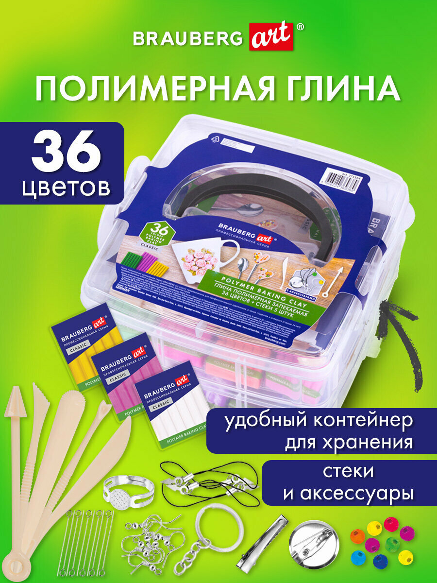 Глина полимерная запекаемая BRAUBERG ART CLASSIC - профессиональная серия. Предназначена для лепки и моделирования, создания игрушек, украшений, предметов интерьера, сувениров. Набор включает в себя 36 брусков (по 20 г) полимерной глины разного цвета, 5 пластиковых стеков, комплект аксессуаров для создания поделок и инструкцию по эксплуатации. Глина ярких и насыщенных цветов, не пачкает и не сушит руки, легко смывается с рук и рабочей поверхности водой или влажными салфетками. Изделия из глины следует запекать в духовке при температуре 130 °С в течение 20-40 минут. Время запекания варьируется в зависимости от толщины изделия и, как правило, составляет 20 минут для толщины заготовки не более 6 мм. После запекания глина становится прочной, не трескается, цвета не тускнеют. Набор в удобном пластиковом кейсе для хранения упакован в прочную коробку из гофрокартона. Перед использованием следует ознакомиться с инструкцией.