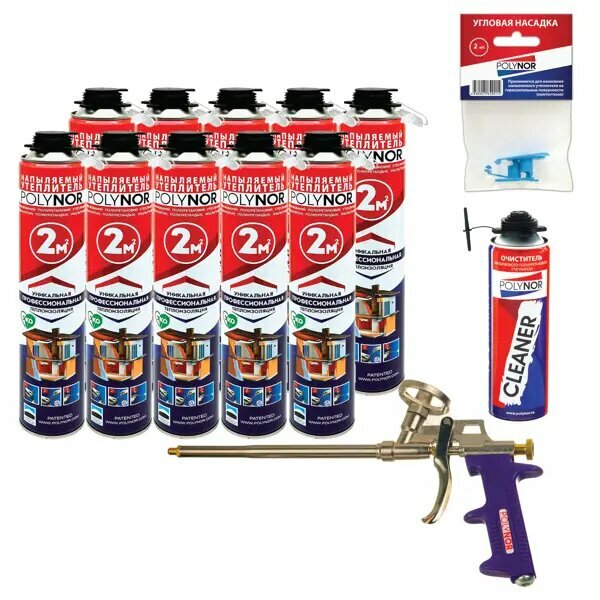 Комплект теплоизоляция Polynor для кровли 10 м² - готовое решение для одного из наиболее распространённых запросов - утепление кровли площадью 10 м². В состав комплекта входит монтажный пистолей для напыления утеплителя, средство для его очистки Polynor Cleaner, а также угловая насадка (2 шт.), позволяющая наносить утеплитель под углом 45о, при этом баллон остается в вертикальном положении, что гарантирует правильный выход утеплителя из баллона при напылении на кровлю (и любые горизонтальные поверхности).