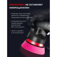Вращательно-орбитальная полировальная машинка подходит для точечного ремонта и обработки труднодоступных участков. Она более плотно использует рабочую поверхность полировальника, что позволяет достичь превосходных результатов без «голограмм». Инструмент прост и удобен в эксплуатации, что снижает усталость и позволяет непрерывно работать в течение длительного времени. Благодаря регулировке частоты вращения можно настроиться на работу с конкретным типом материала. Инструмент не оставляет микроцарапин и гарантирует отличный результат с первого раза. Отсутствует риск перегрева и последующего теплового повреждения поверхности. Ваше преимущество – экономия до 40%: меньше полировальной пасты и больше отдачи.