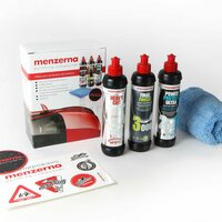 Набор для полировки автомобиля Menzerna. Позволяет произвести комплексную полировку, начиная с удаления значительных дефектов и заканчивая идеальным блеском с защитным слоем. Состоит из трех полировальных составов 250мл. и микрофибровой салфетки:
